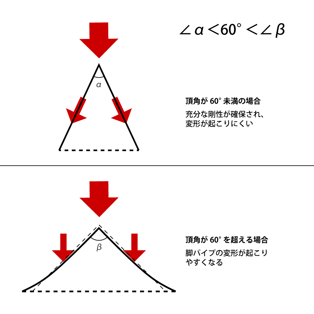 また三脚を横から見た時に、二本の脚パイプと地面が作る三角形に注目してみてください。平坦な地面ではこの三角形は二等辺三角形になると思います。構造力学の難しい話をする気はありませんのでなるべく単純化して説明しますと、画像の通り、頂角の角度が60度未満だと機材の重さを支えるのに十分な剛性が確保されていますが、60度を超えるとパイプが急激にたわみやすくなっていきます。60度を超える角度で開脚できることと安定した撮影ができることはイコールではないのです。